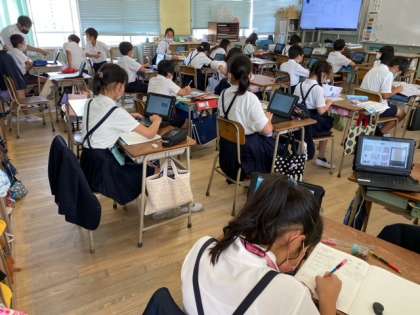 1組の社会科はタブレット端末を使って「世界の国」調べをしていました。