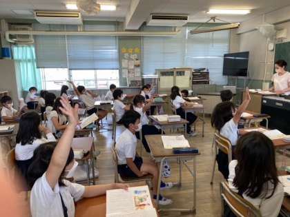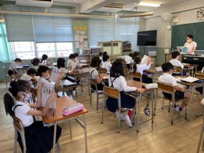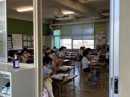 (感染対策として、教室を換気し、机の配置を互い違いにずらす工夫をしています)
