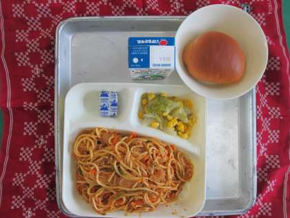 豚挽肉、ベーコンを主材にしたたまねぎ、にんじん、ピーマン、にんにくの入ったカレー味のスパゲッティです。児童に人気のメニューです。