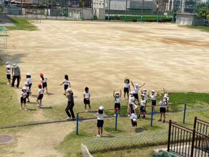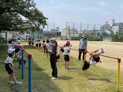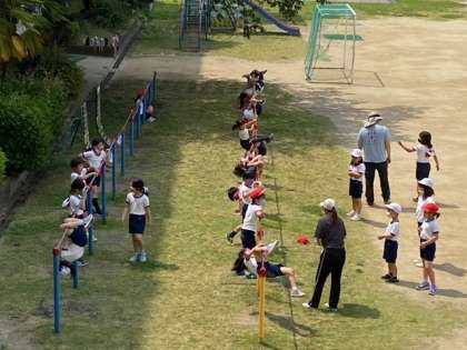 鉄棒をしています。得意な人も苦手な人もいますが、みんな一生けんめいに頑張っていました。