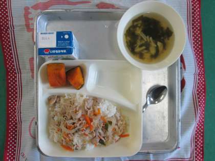豚丼、湯葉のすまし汁、かぼちゃのしょうゆ焼き、牛乳