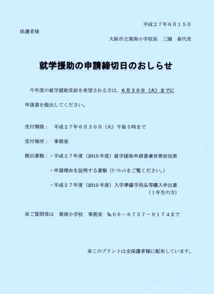 6/15 就学援助申請の締切日のお知らせ