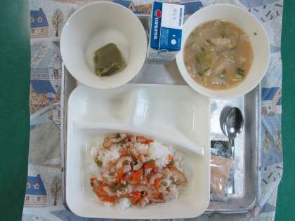 かやくご飯、じゃがいものみそ汁、まっ茶ういろう、牛乳