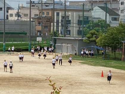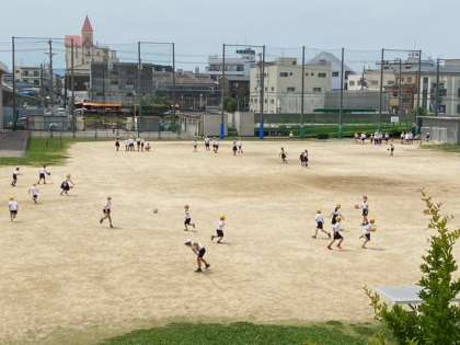 運動場で、元気よく子どもたちが鬼ごっこやボール遊びをしています。
