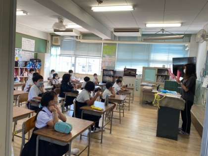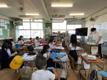 縦割り班で集合しました。個人カードにひもを通し、班の番号や自分の名前などを書きました。当日まわる順番を班のメンバーと相談して決めました。