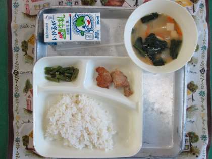 鶏肉のしょうゆバター焼き、とうふのみそ汁、さんどまめのごまあえ、ご飯、牛乳