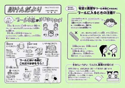 プール水泳がはじまります。水泳は、強いからだと心を育てるのによい運動です。安全で楽しい水泳学習ができるように、一人一人がルールを守り、普段からしっかり体調を整えておきましょう。