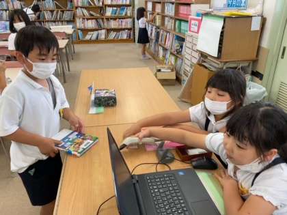 1組の図書の時間です。図書館で本を読んでいます。本の貸し出しもしていました。