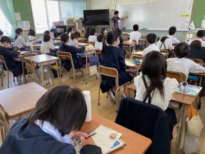 2組の社会科は、歴史の学習です。「古墳は何のためにつくられたのか」堺市にある日本最大の「大仙古墳」の写真を見て考えました。