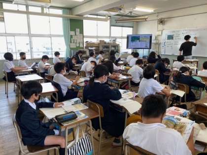 1組の理科では、「心臓と血液のはたらき」を学習していました。新巽中学校の理科の先生が教えています。