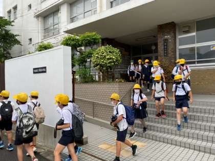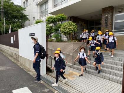 4年生の子どもたちが、柴島(くにじま)浄水場へ社会見学に出発しました。(そのため全校朝会はありません)