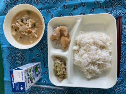 鶏肉のおろしじょうゆかけ、みそ汁、野菜いため、ごはん、牛乳