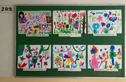 「お花といっしょ」をテーマに、いろいろな場面をイメージして、自分だけの「お花の世界」を描きました。