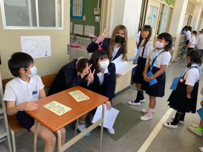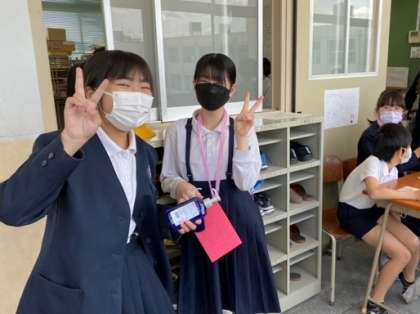 6年生1組の児童が、廊下で消毒液を手にしています。