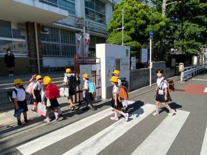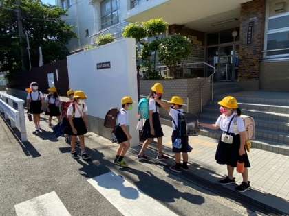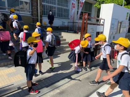 子どもたちが集団登校してきました。 晴れ間が広がり、すがすがしい朝です。