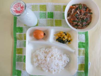 マーボーはるさめ、チンゲンサイとコーンの甘酢あえ、びわ、ご飯、牛乳