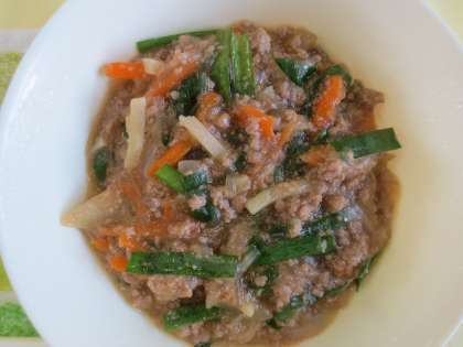 牛挽肉、豚挽肉を主材にはるさめ、たけのこ、にんじん、にらの入ったマーボーはるさめです。