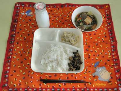 鶏肉とあつあげの煮もの、もやしのゆず風味あえ、ツナわかめそぼろ、ご飯、牛乳