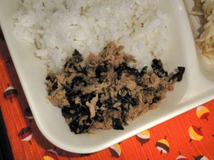 いりごまとフレーク状のツナ缶、わかめをいため、砂糖としょうゆで甘辛く味付けしたご飯に合うメニューです。