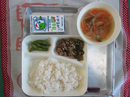 チンジャオニューロウスー、ハムと野菜の中華スープ、えだまめ、ご飯、牛乳