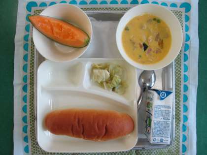 かぼちゃのクリームシチュー、キャベツのゆずドレッシング、クインシーメロン、パン、いちごジャム、牛乳