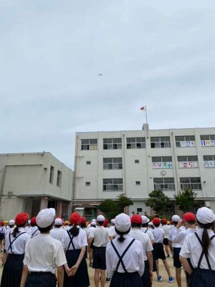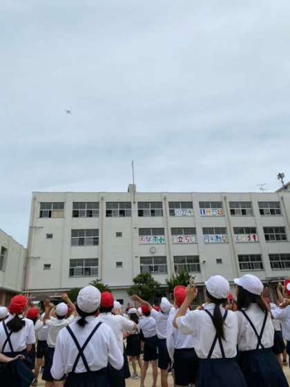 上空を見上げ、ドローンに向かって、子どもたちが手を振っています。