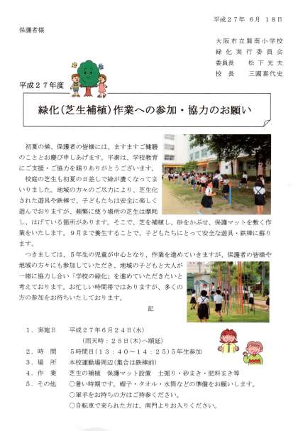 5年生の児童が中心となり、作業を進めていきますが、保護者の皆様や地域の方々にも参加していただき、地域の子どもと大人が一緒に協力し合い「学校の緑化」を進めていただきたいと考えております。お忙しい時間帯ではありますが、多くの方の参加をお待ちいたしております。