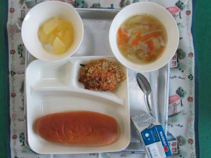 カレードリア、豚肉とキャベツのスープ、りんご(カット缶)、パン、牛乳