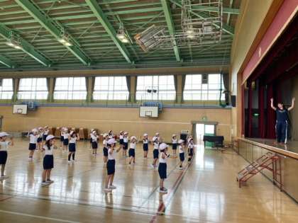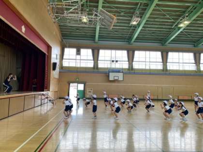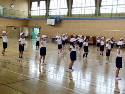 来週から始まるプール学習(1年生は水遊び)を前に、準備運動やプールでの運動・整理運動を練習しました。