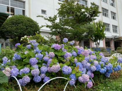 雨上りの運動場わきでは、クローバーやアジサイがしっとりと咲いていました。