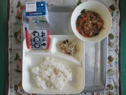 マーボーはるさめ、チンゲンサイともやしの甘酢あえ、いり黒豆、ごはん、牛乳