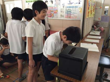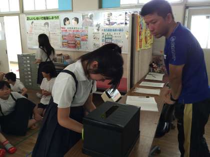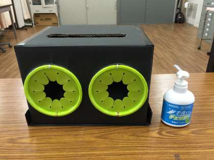 5年生は6月15日と6月17日の体重測定のときに、保健室で手洗いチェッカーの実験をしました。まず、手洗いチェッカーのローションを両手にすりこんだ後、普段通りに石けんで手を洗います。