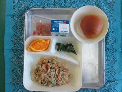 和風焼きそば、オクラの甘酢あえ、オレンジ、黒糖パン1/2、牛乳