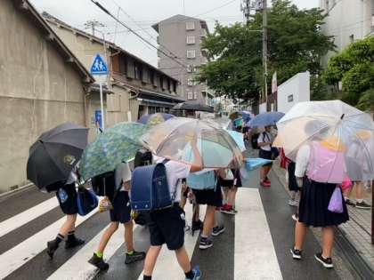 梅雨空の中を、子どもたちが集団登校してきました。