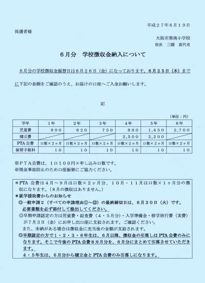 6月分の学校徴収金振替日は、6月26日(金)です。よろしくお願いいたします。