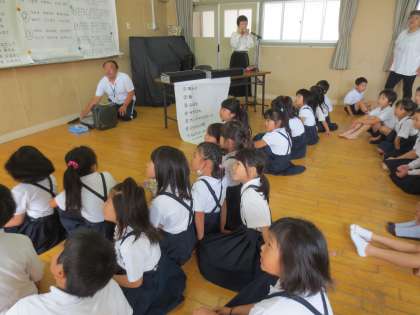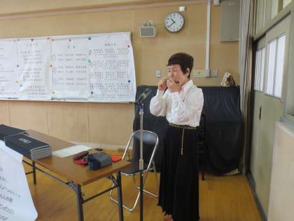 地域の「乾さん」が20分休憩の時に、ハーモニカでドラエモンやアンパンマンなどの楽しい演奏をしていただきました。