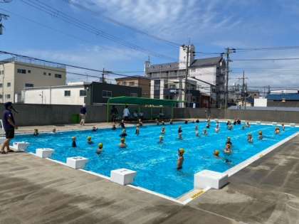 まずは、水に慣れることから、子どもたちが向かい合って水をかけあっています。