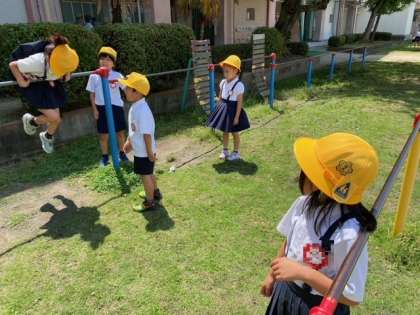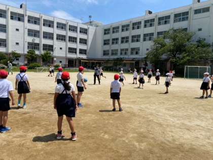 休み時間の 外遊びは、帽子をかぶり、マスクを外すように声かけをしています。