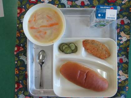 サーモンフライ、豆乳スープ、きゅうりのバジル風味サラダ、パン、牛乳