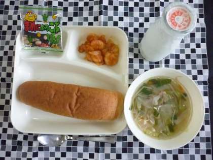 えびのチリソース、中華スープ、豆こんぶ、ライ麦パン、牛乳