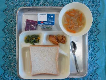 鶏肉のカレーマヨネーズ焼き、てぼ豆のスープ、さんどまめとコーンのサラダ、コッペパン、ブルーベリージャム、牛乳