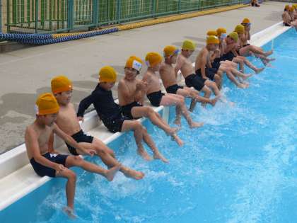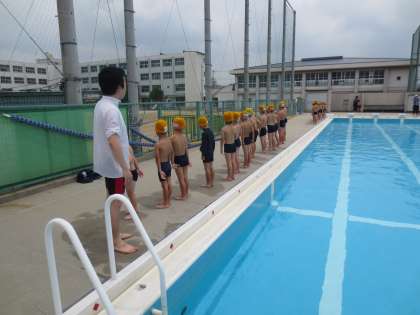 最初にプールへの入り方を練習します。1〜4の合図で順にプール入ります。どの学年も安全のために同じように入ります。