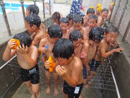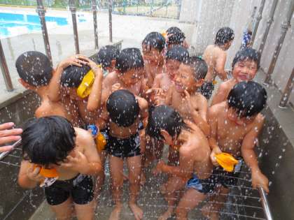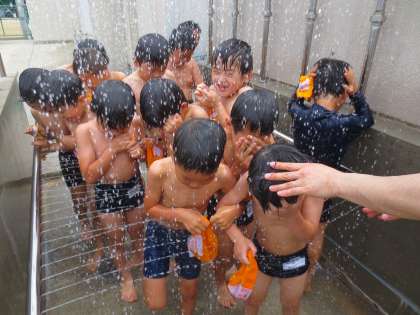 プールに入る前に、シャワーで水になれることも大切です。でも・・・みんなすごい顔をしてシャワーをあびていますね。