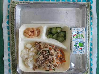 牛丼、きゅうりのしょうがづけ、大福豆の煮もの、牛乳