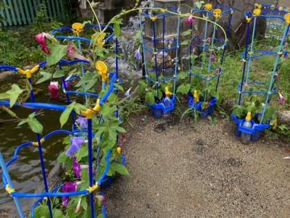 1年生のプランターでは、アサガオがいっぱい咲いていました。
