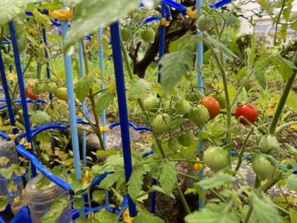 2年生のプランターでは、ミニトマトが赤く色づき始めました。