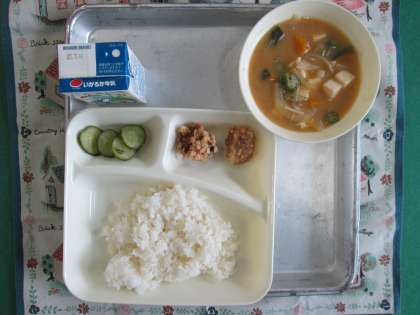 豚肉のたつあげ、みそ汁、きゅうりの甘酢づけ、ごはん、牛乳