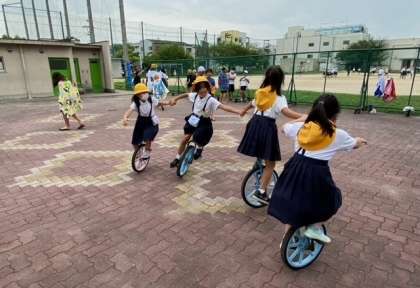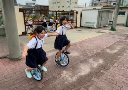 「いちりんしゃ(一輪車)」で遊ぶ 子どもたちです。