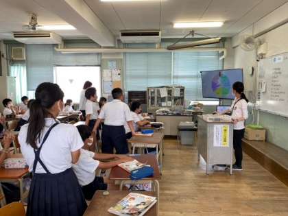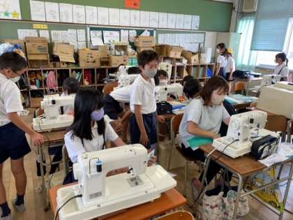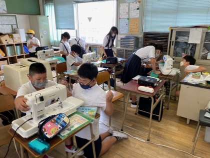 ・家庭科は、冷房の効いた教室でのミシン実習です。協力しながらミシンを動かしていました。