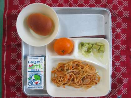 チキントマトスパゲッティ、グリーンアスパラガスとキャベツのサラダ、みかん(冷凍)、パン、牛乳